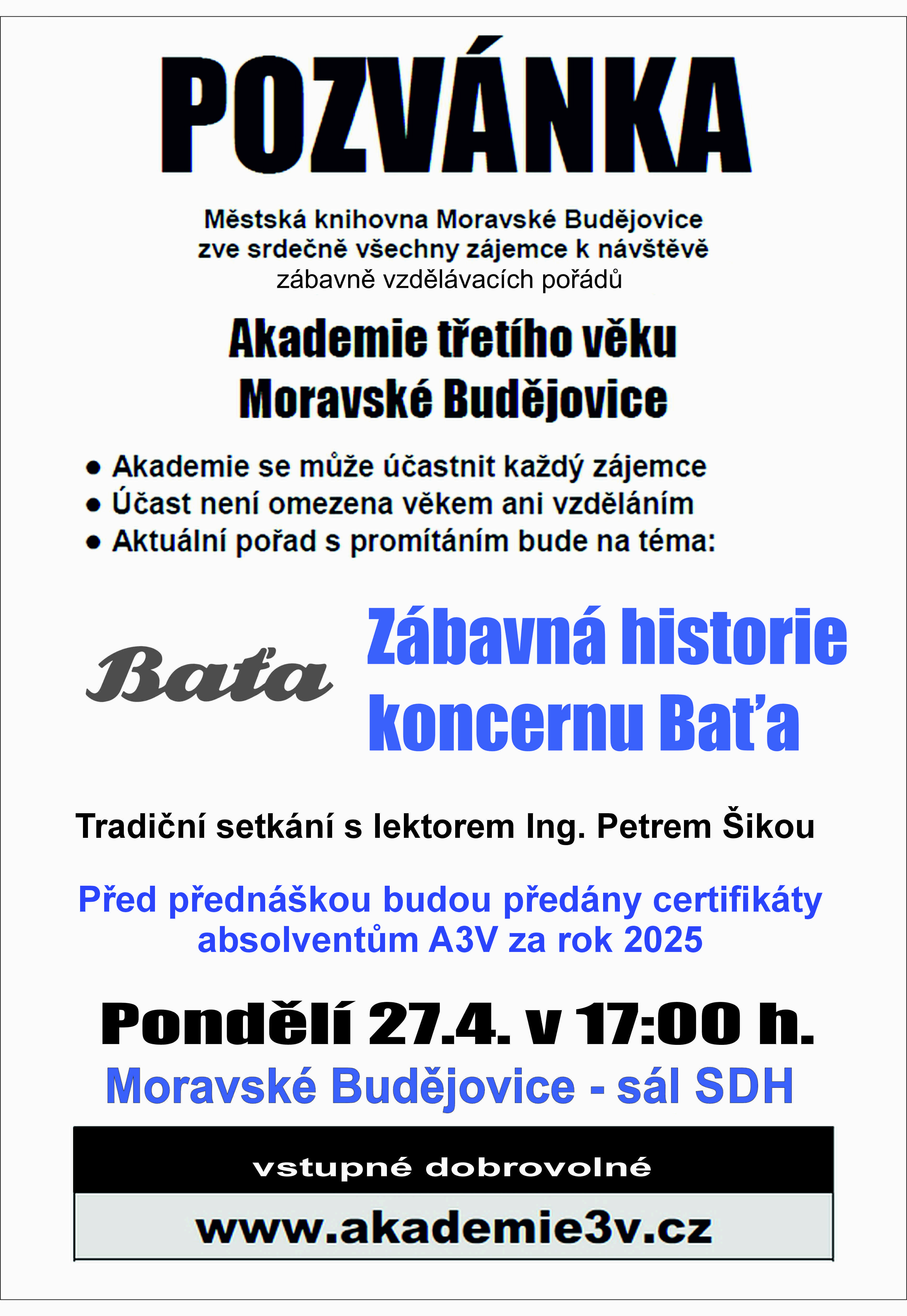 Před přednáškou budou předány certifikáty absolventům A3V za rok 2025
