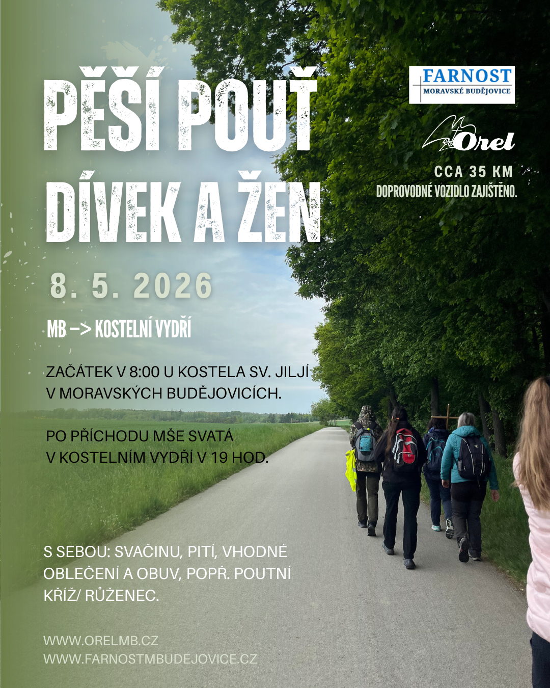 Srdečně zveme na každoroční pouť dívek a žen z Moravských Budějovic do Kostelního Vydří. Pokud je to na Vás moc, nebojte se přidat jen na část cesty! Budeme se na Vás těšit (;