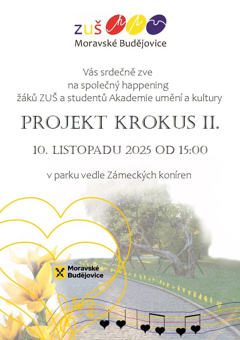 Happening a vystoupení žáků ZUŠ a studentů Akademie umění a kultury během vysazování cibulek krokusů.