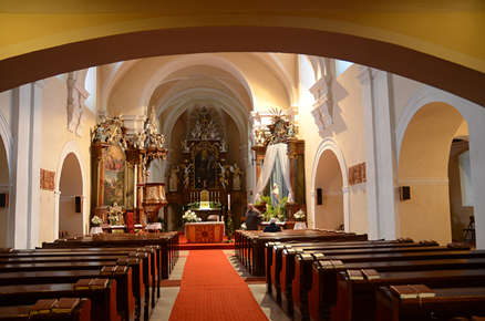 Uvnitř chrámu na vás čeká bohatá barokní výzdoba. Hlavní oltář zdobí obraz od vídeňského malíře Ignáce Dullingera. Za pozornost stojí i netradiční křížová cesta od Jana Floriana a sochařská díla Jaroslava Šlezingera.