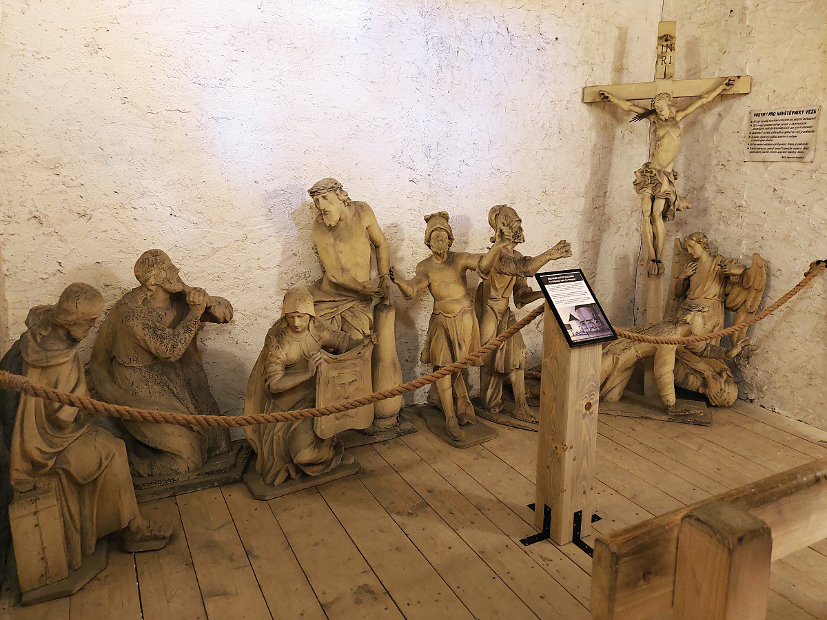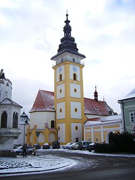 Dominantou chrámu je cca 50 metrů vysoká věž, která byla vystavěna roku 1714 a sloužila nejen jako zvonice, ale i jako pozorovatelna a byla spojena krytou chodbou se zámkem. Jsou v ní zavěšeny dva dochované zvony z 16. století. Od června do konce září můžete z ochozu věže, který je ve výšce 26 m a na který vede 128 schodů, obdivovat krásu města a okolí.